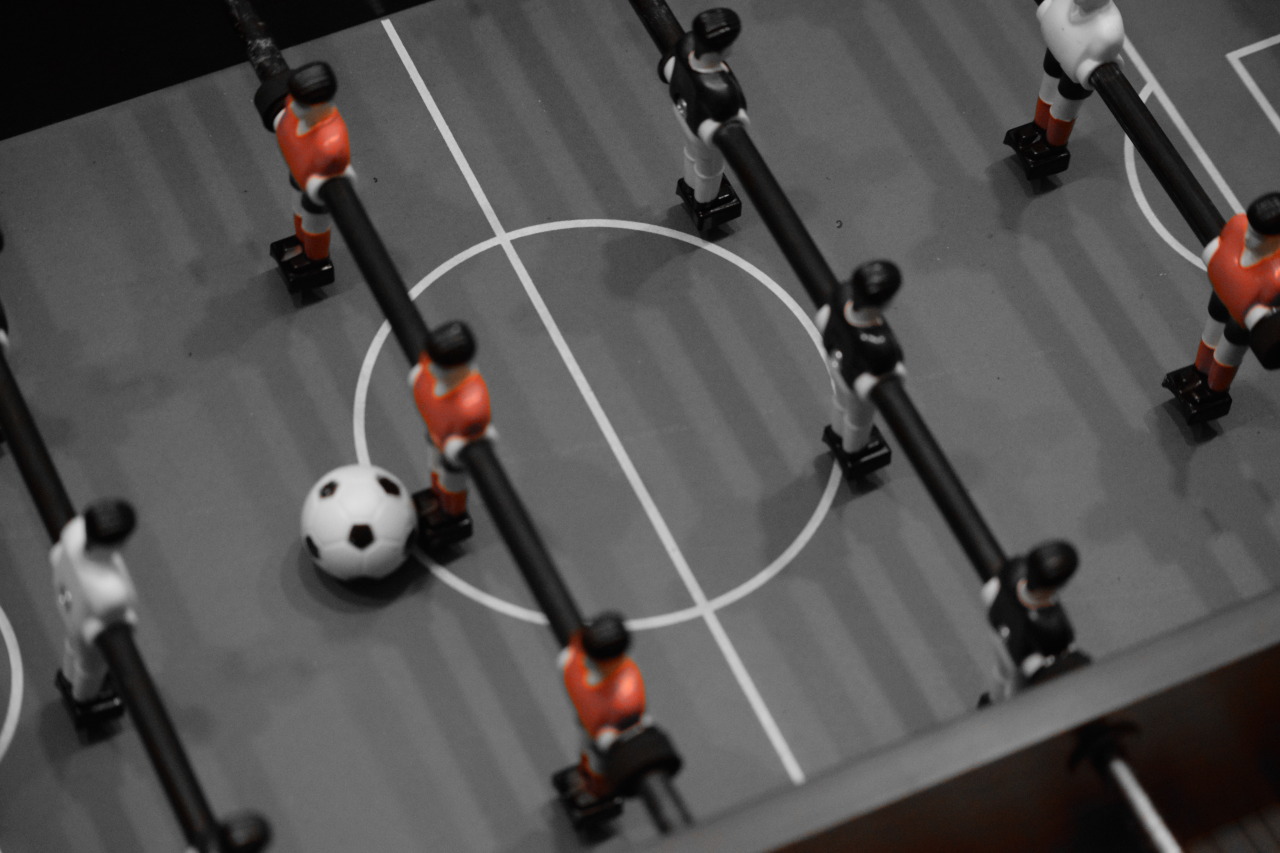 For over a year, maybe two now, we have had a table-top Foosball set (pictured) in our house. It’s a miniature version of the barroom game that has undoubtedly set off more drunken brawls than guys fighting over women. It’s an intense game.
